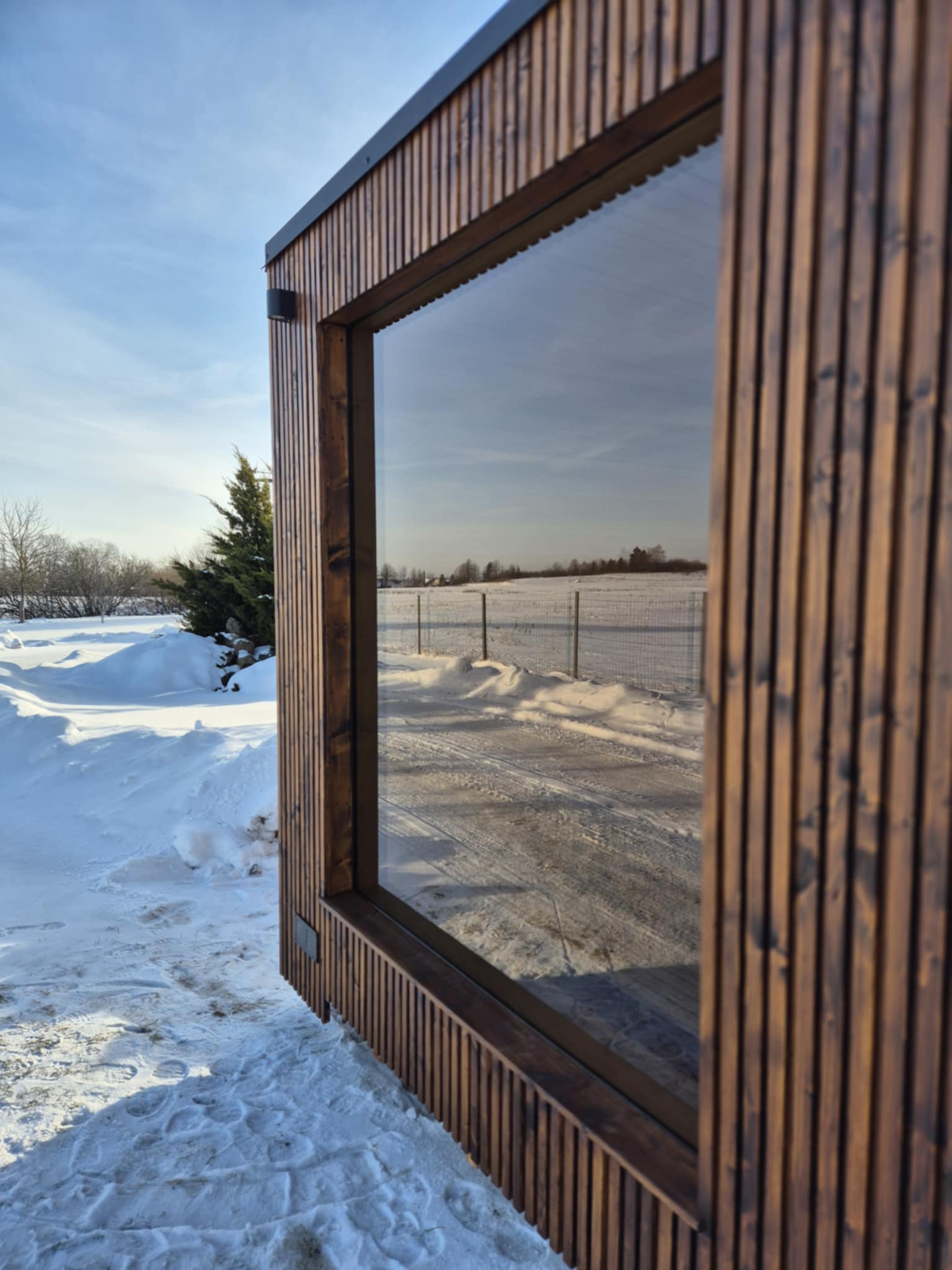 Det stora panoramafönstret i kombination med isolerat dubbelglas förbättrar värmehållningen samtidigt som det ger ett ljust, öppet basturum med ökad komfort för användning året runt.